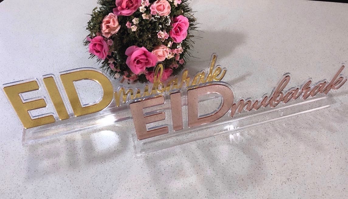 Celebrate in style & compliment your Eid tablescape with this simple yet stunning Eid Mubarak table stand.Mirror Gold or Rose Gold layered over clear acrylic on a clear stand.