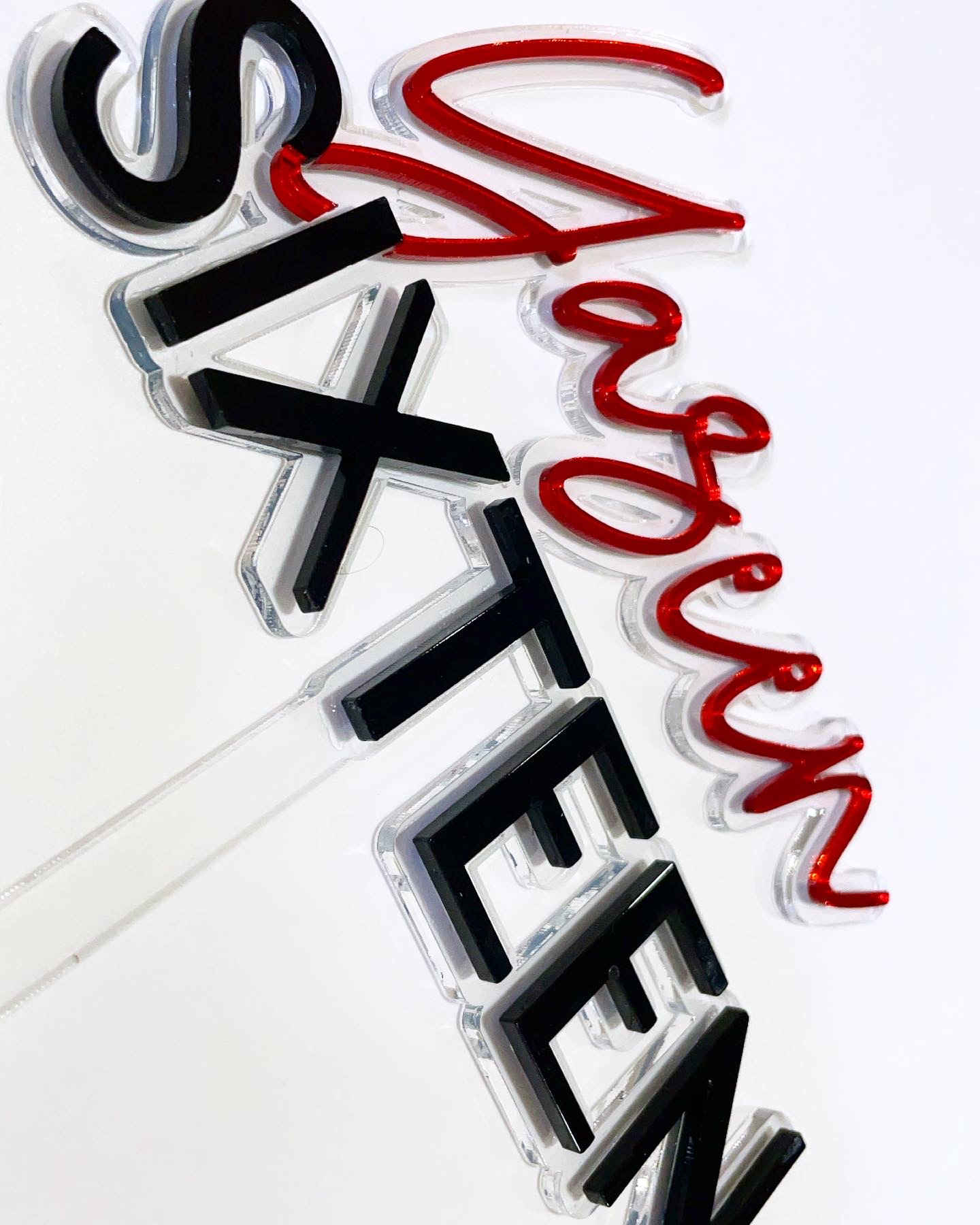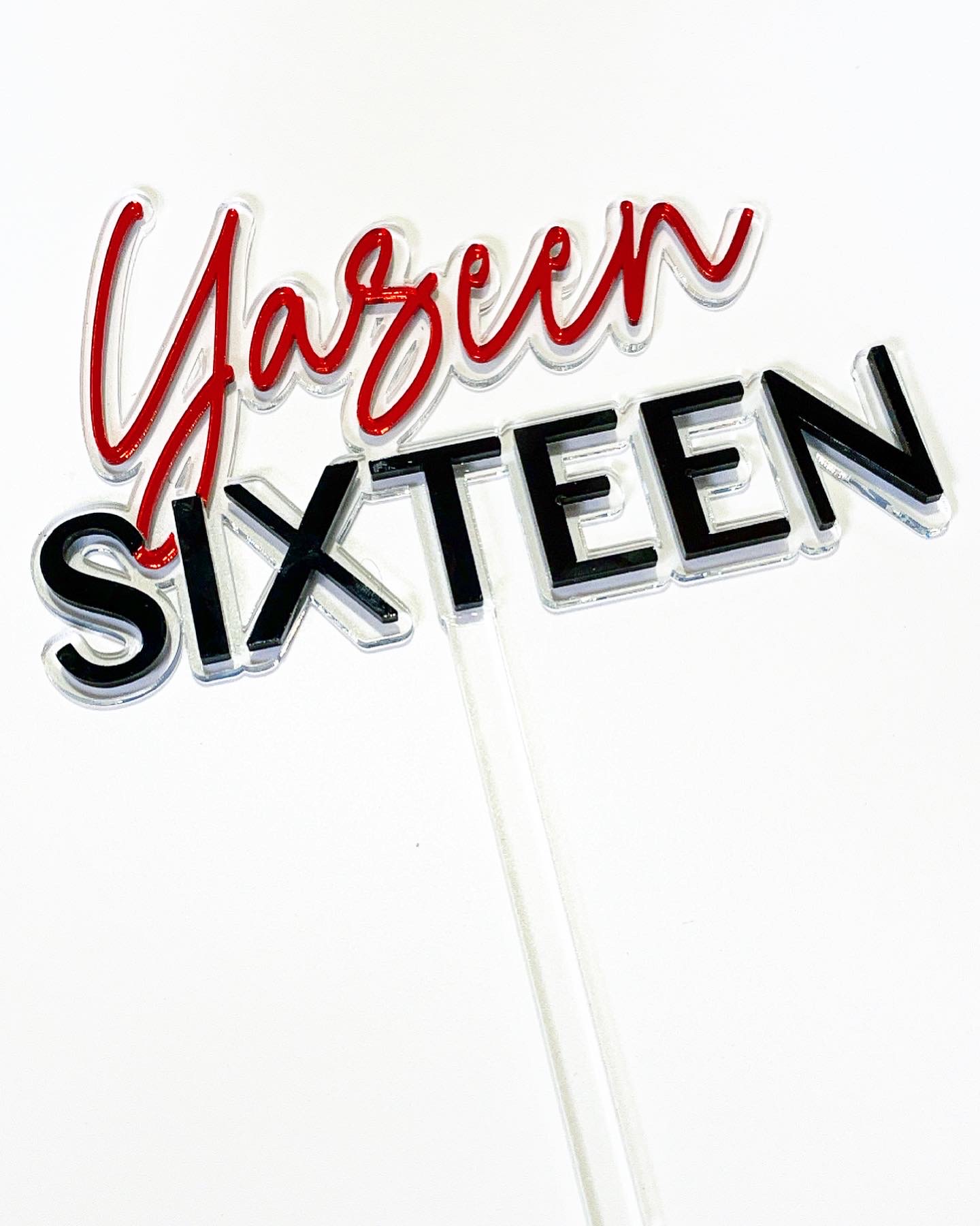 Layered name and age Caketopper in a modern script. A two colour combination of mirror and perspex layered over clear acrylic makes a bold statement.
